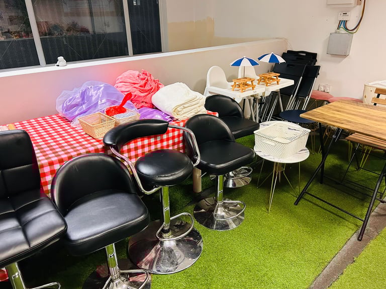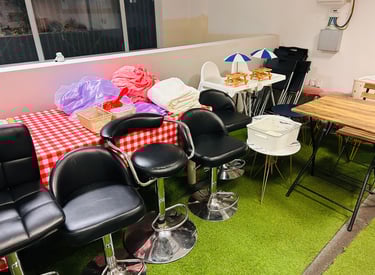 Modern upstairs party space with cosy lighting, sound system, and decoration ready — just bring your friends!